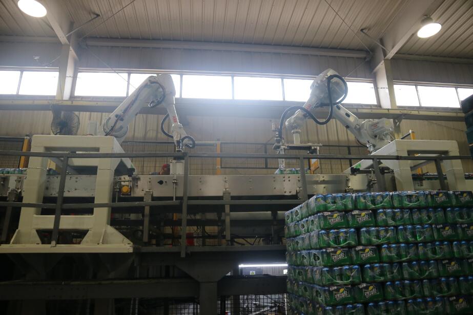 此設備是南京恒昌根據客戶的實際需求進行定制的,滿足現有普罐9箱、10箱花型、SLEEK CAN、MINI SLEEK CAN13箱花型碼垛需求,并且具備未來2*6、3*4、3*5花型升級功能和生產能力,單臺能力達到60箱/分鐘。設備主體采用ABB智能機器手,通過 SEW伺服電機帶動雙向絲桿,來驅動固定在2根進口導軌上的夾板,對包型夾護后由機器人來進行位移分道,轉向。設備運行穩定,高效,占用空間小,減少了對箱包的碰撞和磨損。